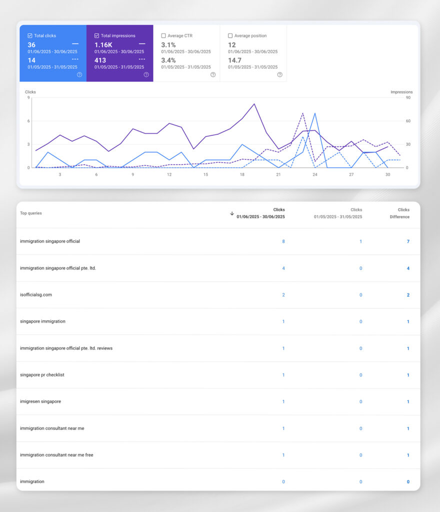 As a newly launched website, ISO had limited authority, thin or generic metadata, and uneven keyword targeting—making it difficult to surface for competitive immigration terms. The priority was to win early impressions and clicks without changing the site’s visual design or disrupting lead flows.