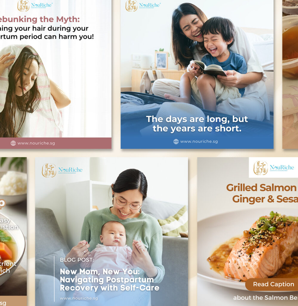 To address this, we worked closely with NouRiche to translate their vision into designs and messaging that are warm, clear, and approachable. The focus was on visuals and language that speak directly to mothers, highlighting care, recovery, and nourishment. Educational elements were added to increase awareness about postpartum nutrition, while emphasizing NouRiche’s use of fresh, high-quality ingredients. This ensures that what is designed truly connects with and supports mothers in their journey after childbirth.
