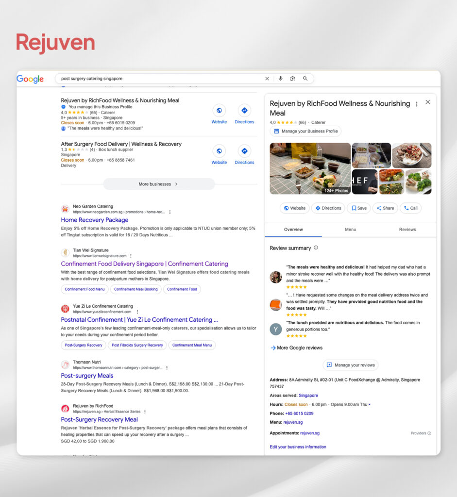 Rejuven struggled with low visibility in local wellness and healthy catering categories due to incomplete profile data and minimal customer interactions. This affected their ability to reach health-conscious users searching for diet-friendly meal services.