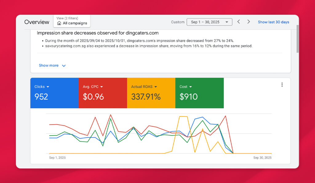 Adjusted asset groups and keyword strategy, introduced automated bidding rules, and refined ad visuals based on conversion trends.