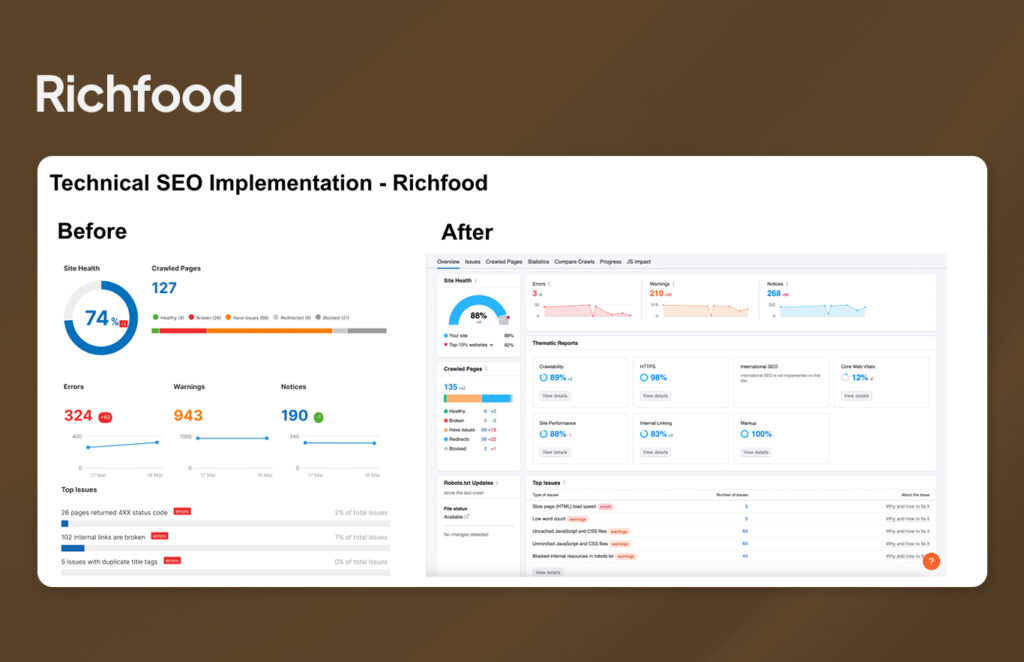 RichFood competes on generic “buffet catering” queries, but the site had inconsistent metadata, duplicate URL variants, and fragmented sitemaps. Mixed legacy templates caused CLS/LCP instability on phones, while unclear non-halal indicators led to poor engagement from halal-seeking users.