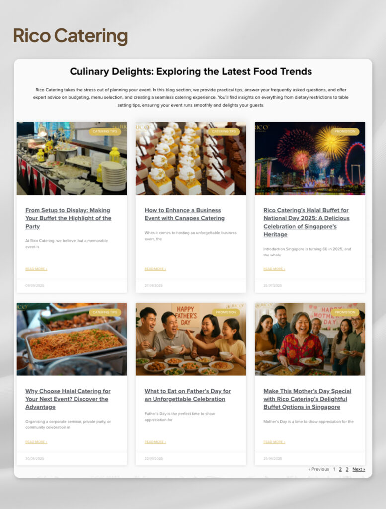Improved Rico Catering’s search presence by producing structured, SEO-focused blog articles tailored to event and corporate catering queries. The refined content approach increased relevance for users searching for catering solutions and enhanced overall organic discoverability.
