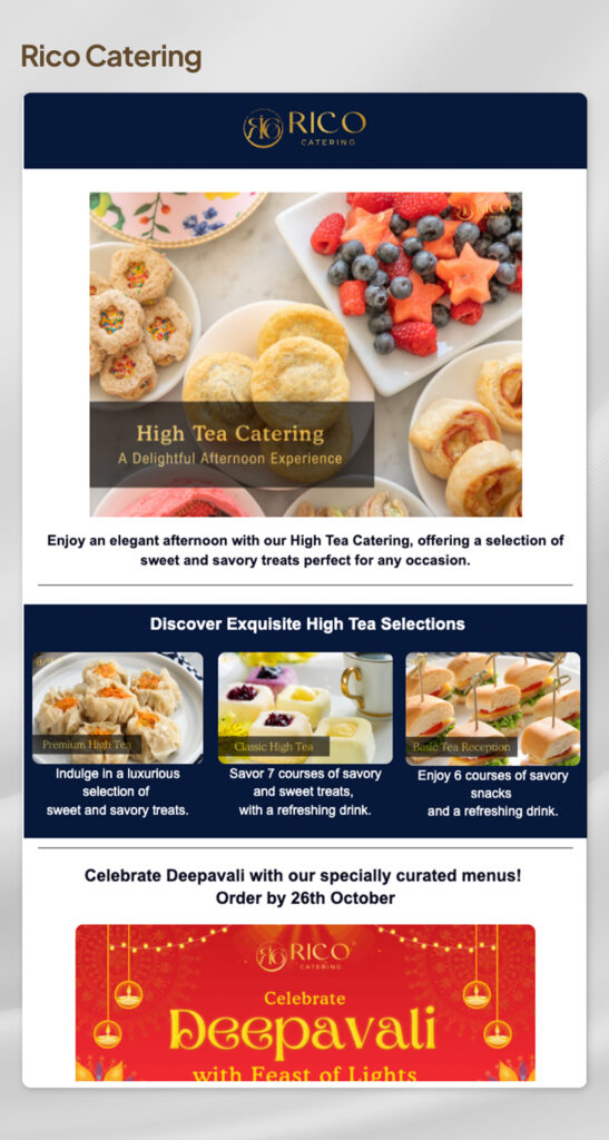 Rico Catering serves various event segments, but lacked consistent communication with prospective clients. Their emails didn’t effectively showcase unique event packages or drive conversions for inquiries and bookings.