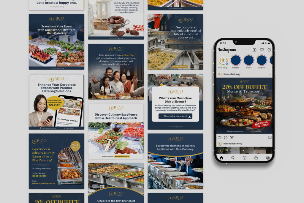 We solve this challenge by drawing inspiration from premium, hotel-style catering designs that perfectly match our navy blue and gold brand colors. To ensure customers immediately understand our value, we showcase mouthwatering food photography that reflects both elegance and quality. Each post is carefully curated to highlight our premium, healthy, and halal promise, creating a strong visual identity. With consistent posting of 8–10 updates per month, we aim to build awareness, trust, and customer connection effectively.